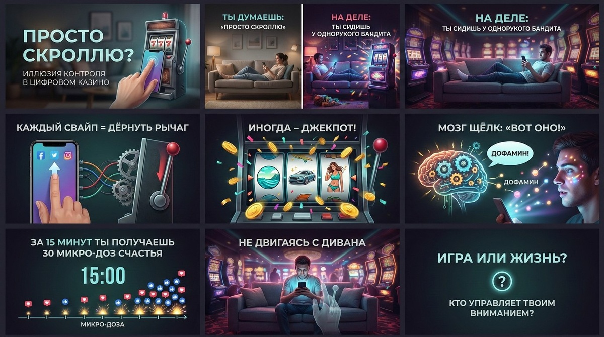 Мозг щёлк: «Вот ОНО!» – и шлёт дофамин. За 15 минут ты получаешь 30 микродоз счастья, не двигаясь с дивана. Иногда – джекпот: бирюзовое море, новая машина, тонкая талия.Ты думаешь, «просто скроллю». На деле ты сидишь у однорукого бандита: каждый провод пальцем = дернуть рычаг. Продолжение в блоге