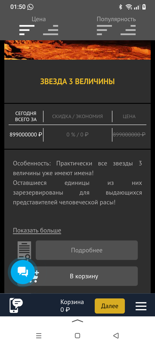 Ещё обещают, что когда кончатся все свободные звёзды, ваша звезда станет раритетом и её можно будет передарить кому-нибудь как ну очень редкий подарок или очень дорого продать. Кстати звёзд осталось очень мало, спешите купить по акции. Цена на скрине ниже.