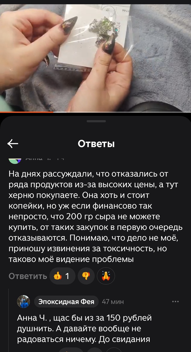 Дело вот в чем. Я тут поделилась видео, где распаковываю браслеты общей стоимостью на сто пятьдесят рублей. Если быть точным на 167. Это абсолютно дешёвые браслеты для того, чтобы я могла их надевать во время работы, например, когда крашу или мою полы, или убираю лотки за кошками- и вот честно, моя жизнь становится от этого повеселее. Они чудесно сверкают, я люблю все блестящее, абсолютно не буду заморачиваться, если с ними что-то случится. И в комментариях тут же нашёлся человек, после которого надо открывать форточку, а лучше целое окно. Ну как же так вы тут жаловались, что не можете себе купить то, это из продуктов и вообще вот такие траты надо убирать самыми первыми...