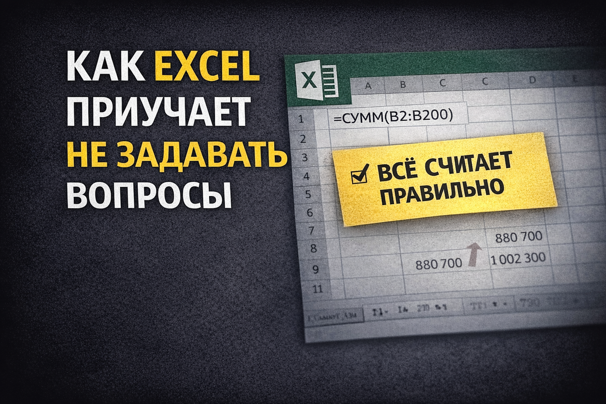 Почему даже опытные пользователи постепенно перестают сомневаться в отчётах и как Excel формирует автоматическое доверие. Когда человек только начинает работать с таблицами, он сомневается. Проверяет диапазоны. Пересчитывает вручную. Сравнивает результаты. Формулы вызывают настороженность. Любая ошибка вроде #ДЕЛ/0! или #ЗНАЧ! воспринимается как тревожный сигнал. Excel кажется непредсказуемым, а расчёты — хрупкими. Но со временем всё меняется. Если файл открывается каждую неделю и выдаёт привычный результат, мозг перестаёт воспринимать его как источник риска. Повторяемость создаёт ощущение устойчивости. Формула: =СУММ(B2:B200) работает корректно месяцами. Итог меняется постепенно. Диапазон не пересматривается. И именно это постоянство снижает внутреннюю настороженность. Excel начинает восприниматься как фон, а не как инструмент анализа. Есть важный сдвиг, который редко замечают. Таблицу перестают проверять — её начинают просто обновлять. Добавляют строки. Копируют формулы. Меняют даты