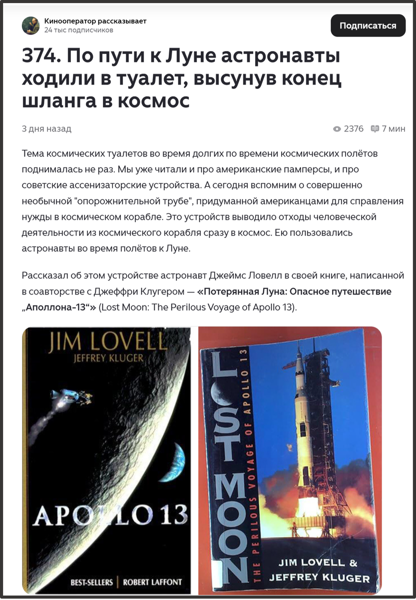 Как астронавты справляли малую нужду: Очень просто. Они соединяли свой... естественный агрегат к космическому шлангу, открывали вентиль и ... прямо в космос! Представили? Ловелл или Борман вставляют свои естественные шланги в шланги космические и орошают космическое пространство вокруг командного модуля. Красота! Не верите? А вот читаем. Коновалов этот перевод книги Ловелла и Клюгера (соавторы) поместил:
