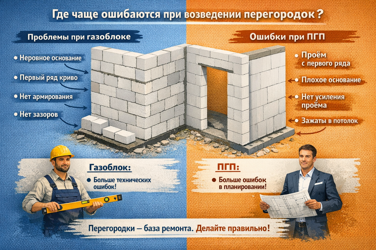 После демонтажа кажется, что самое сложное позади. Теперь нужно просто «поставить стены». На практике именно на перегородках: Причина простая — перегородки ставят без понимания технологии и различий материалов. Чаще всего выбор стоит между: Оба варианта нормальные. Но ошибки в них — разные. Газоблок — материал удобный, лёгкий и достаточно прочный. Но он требует дисциплины при кладке. Перегородку начинают ставить прямо на плиту перекрытия. 📌 Что должно быть: основание выравнивается цементным раствором, если есть перепады. Если этого не сделать: А это уже лишние деньги и потеря полезной площади. Первый ряд — это фундамент всей перегородки. Он должен: Что делают неправильно: 📌 Итог — перекос проёма и проблемы при установке двери. По нормативам допускается армировать реже. Но практика показывает — лучше армировать каждый второй ряд. Если этого не сделать: Газоблок не должен упираться: Нужны: Если перегородку «зажать»: ПГП — материал быстрее в монтаже, геометрия ровнее. Но он более требо