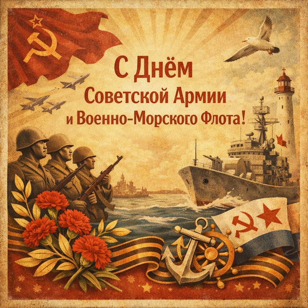 С Днем Советской Армии и Военно-Морского Флота, товарищ! Желаю тебе, чтобы все твои "враги" капитулировали без боя: лень — чтобы дала тебе отдохнуть, проблемы — чтобы растворились, а теща — чтобы наконец признала тебя главнокомандующим семьи. Пусть твоя "военная смекалка" помогает тебе уворачиваться от просьб забить гвоздь прямо во время футбольного матча, а "тактическая гибкость" — находить компромисс между "хочу пива" и "надо везти детей в школу". Желаем тебе, чтобы твой "тыл" был надежным, как броня танка, а "боевое братство" с друзьями — вечным, как советский союз. Ура!