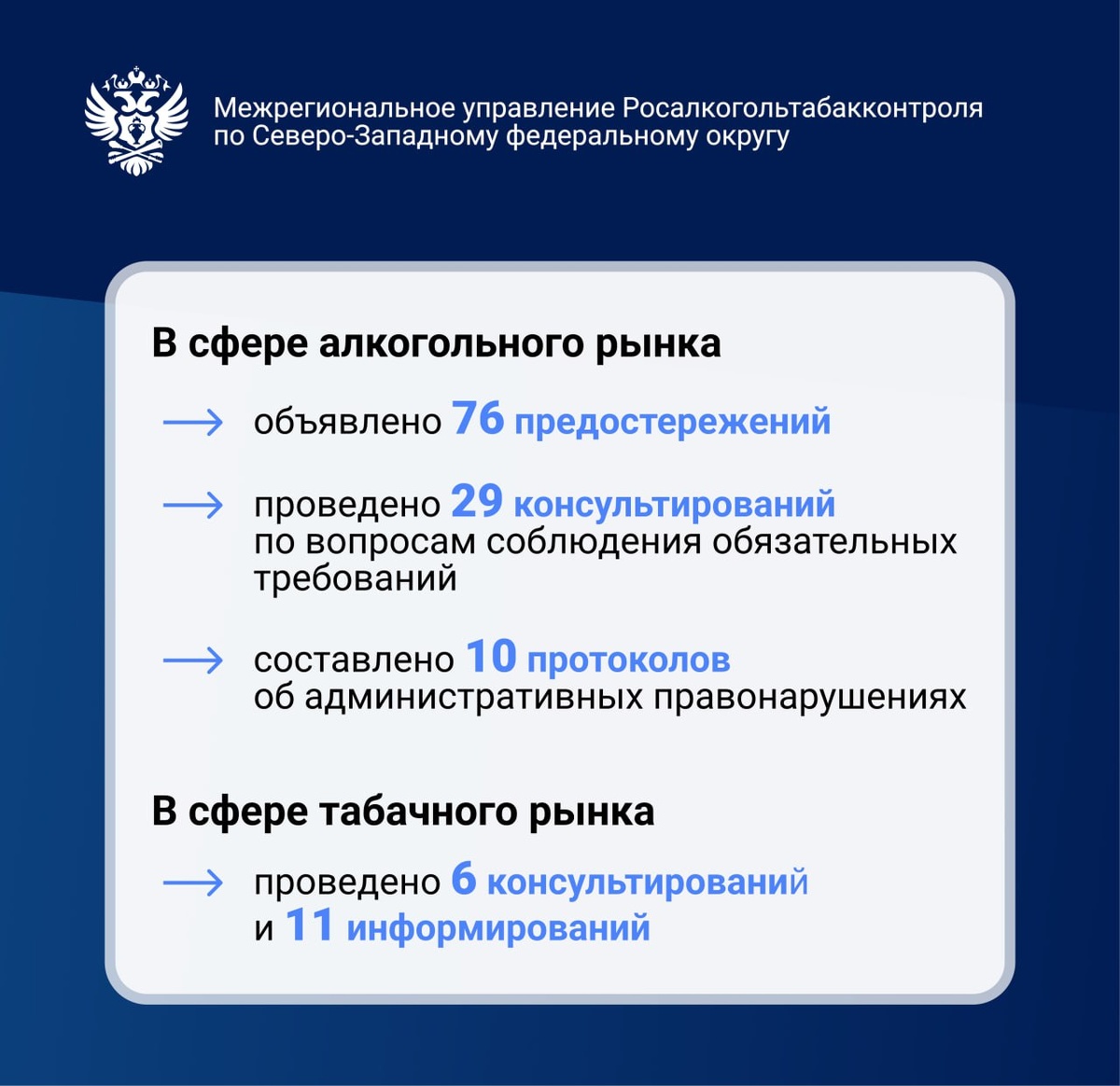 мероприятия в отношении участников рынка. В сфере алкогольного рынка: 🔻 объявлено 76 предостережений; 🔻 проведено 29 консультирований по вопросам соблюдения обязательных требований; 🔻 составлено 10 протоколов об административных правонарушениях. В сфере табачного рынка проведено: 🔻 6 консультирований; 🔻 11 информирований. 📘 Подробный отчёт о результатах работы управления Росалкогольтабакконтроля по Северо-Западному федеральному округу за январь 2026 года доступен на сайте. #СЗФО Росалкогольтабакконтроль МАХ | ВКонтакте | Telegram