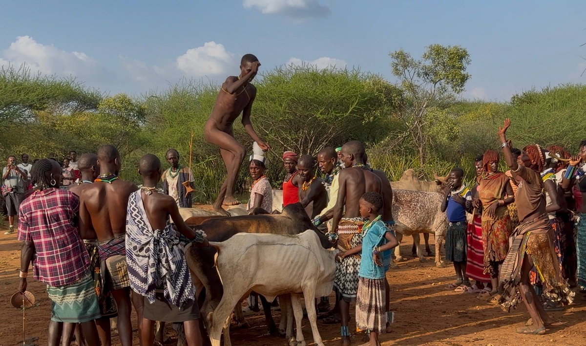 Церемония bull jumping (буквально переводится как «прыжки через быков») — это центральный и самый известный ритуал племени хамер, проживающего в долине реки Омо, Эфиопия. Это обряд, знаменующий переход мальчика во взрослую жизнь. Официальное название церемонии — Ukule. Её ключевой участник — мазит — молодой человек, проходящий инициацию. Ритуал порки женщин Эвангади: это один из самых ярких и часто неправильно понимаемых элементов. Женщины племени (родственницы и знакомые мазита) провоцируют мужчин на то, чтобы их выпороть гибкими прутьями (мича). Женщины демонстрируют свою преданность и любовь к будущему мужчине, а шрамы от прутьев считаются доказательством их смелости и символом их социальной значимости. Этот акт также укрепляет связь между женщиной и мазитом, который в будущем будет обязан её защищать. Прыжки через быков. От 4 до 30 коров и быков выстраивают в плотный ряд. Задача мазита трижды пробежать обнажённым по спинам животных по всей длине ряда. - Успешное прохождение испы