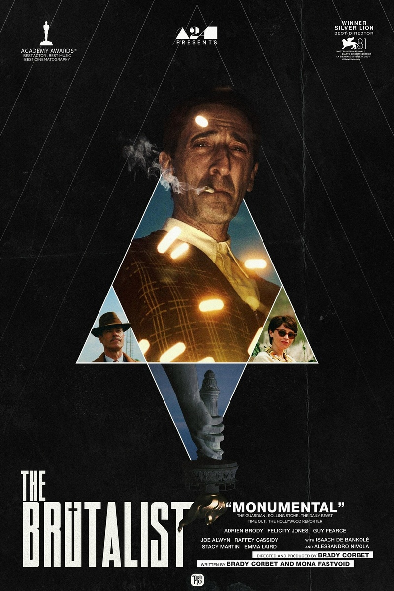 Первое, что хочется сказать о драме "Бруталист", то это - амбициозный и оригинальный фильм, подобных которому не существует. Брэйди Корбет, режиссёр и соавтор сценария, исследует жизнь американца, имея небольшой бюджет и используя устаревшие кинематографические приёмы, стараясь запечатлеть те или иные аспекты жизни героев, сталкивающихся с преградами. Ранее, в 2018 году Корбет выпустил драму "Vox Lux", в которой хаотичные идеи соседствовали с посредственной режиссурой. Но в "Бруталисте" - более структурированное повествование, рассказывающее об эмоциональных ранах венгерского архитектора в послевоенное время. Корбет и сценаристка Мона Фаствольд стремятся к демонстрации масштабного полотна, и зрителю, возможно, сложно смотреть три с лишним часа на страдания героев, "Бруталист" - фестивальная картина, заслуживающая внимания! Пережив Холокост, Ласло переезжает из Будапешта в Америку. Он - архитектор, подсевший на героин из-за перелома носа, оставивший в Венгрии свою жену Эржебет и осирот