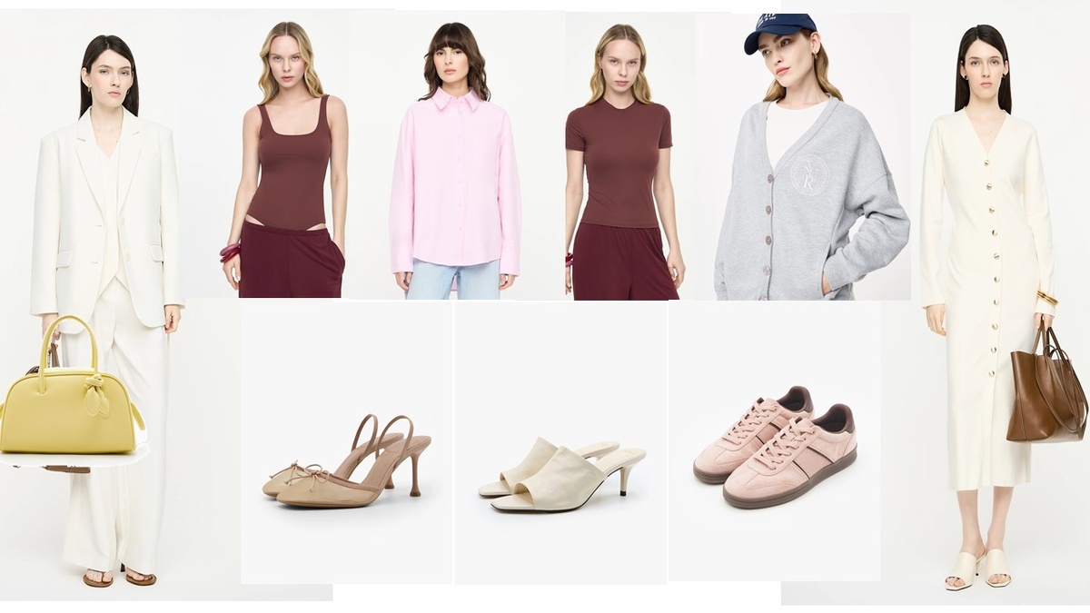 Приветствую вас, дорогие читатели! Только кажется, что говорить про лето ещё рано, на самом деле бывает такая весна, что из зимних сапог переобуваешься сразу в босоножки. Весенние коллекции почти окончательно вытеснили из магазинов остатки распродажи и манят покупателей чудесными оттенками. MAAG в этом плане постарался: все оттенки белого, молочного шоколада и конечно пастель - радуют глаз, а из новинок легко сложилась капсула на 5 рабочих дней, ну например, в нестрогом офисе. Главным выступил деловой костюм в белом цвете, добавила к нему боди, футболку, рубашку, кардиган-толстовку, платье на пуговицах (сыграло роль кардигана) + три пары обуви и одна сумочка. Итого: 10 предметов гардероба на 5 рабочих дней. День 1. Пиджак и брюки прямого кроя, у пиджака пояс-шнурок, отлично смотрится на талии или завязанным сзади. Что взяла в комплект: боди из тонкой эластичной ткани, бежевые туфли из сетки, сумка-боулинг желтого цвета, использовалась во всех комплектах. День 2. Меняю боди на розовую