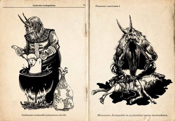 У. Паркинсон нанял человека, одетого как рождественская булочка, чтобы тот забрался на дымоход его магазина в качестве маркетингового хода В 1863 году художник Томас Наст создал свою собственную версию Санта-Клауса Он добавил персонажу усы и бороду и одел его в меха В 1885 году бостонский печатник Луис Пранг напечатал рождественские открытки, на которых он изобразил Санта-Клауса в красном костюме До этого костюмы Санта-Клауса были разных цветов: синие, зелёные, фиолетовые, серые, полосатые А до этого «Дед Мороз», или точнее, «Рождественский Дед», чаще всего был персонажем, которого стоило опасаться Например, финский рождественский Joulupukki выглядел так, как на этих картинках Ещё в XIX веке его изображали в козлиной шкуре и с рогами И он не дарил подарки детям, как Санта-Клаус или Дед Мороз, а спрашивал их, как они провели год, что сделали хорошего и плохого Если плохое перевешивало, то этот «Дедушка» сёк детей розгами, а если было одно плохое, то он мог сварить ребёнка заживо в