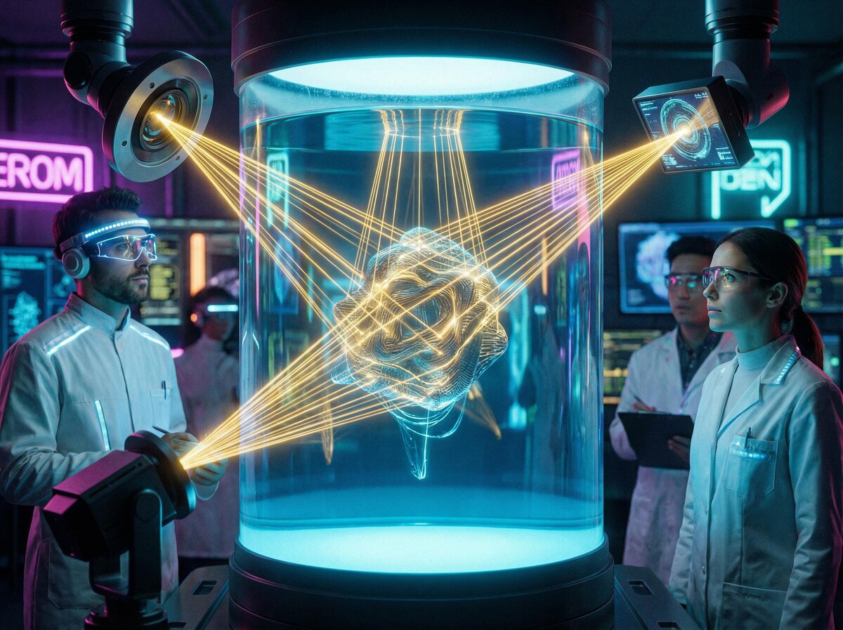 Представьте: вы нажимаете кнопку, и через мгновение в прозрачной капле жидкости появляется готовый трёхмерный объект - сложный, точный, размером с маковое зернышко. Не послойно, не за часы, а буквально в один миг. Звучит как фантастика? Для учёных из Университета Цинхуа (Китай) это уже реальность. Их новая технология 3D-печати под названием DISH заставляет пересмотреть всё, что мы знали о создании вещей. Обычная 3D-печать похожа на строительство дома кирпичик за кирпичиком. Даже самые быстрые современные принтеры «рисуют» объект слой за слоем - снизу вверх. Процесс может занимать от получаса до нескольких часов, а для миниатюрных деталей с микроскопической точностью ещё дольше. Есть и другой подход объёмная печать, где свет проецируется внутрь светочувствительной смолы сразу во всех направлениях. Но и здесь есть проблема: чтобы «нарисовать» 3D-структуру, приходится вращать либо сам контейнер со смолой, либо источник света. Это как снимать объект на 360° камерой - долго, сложно в технич