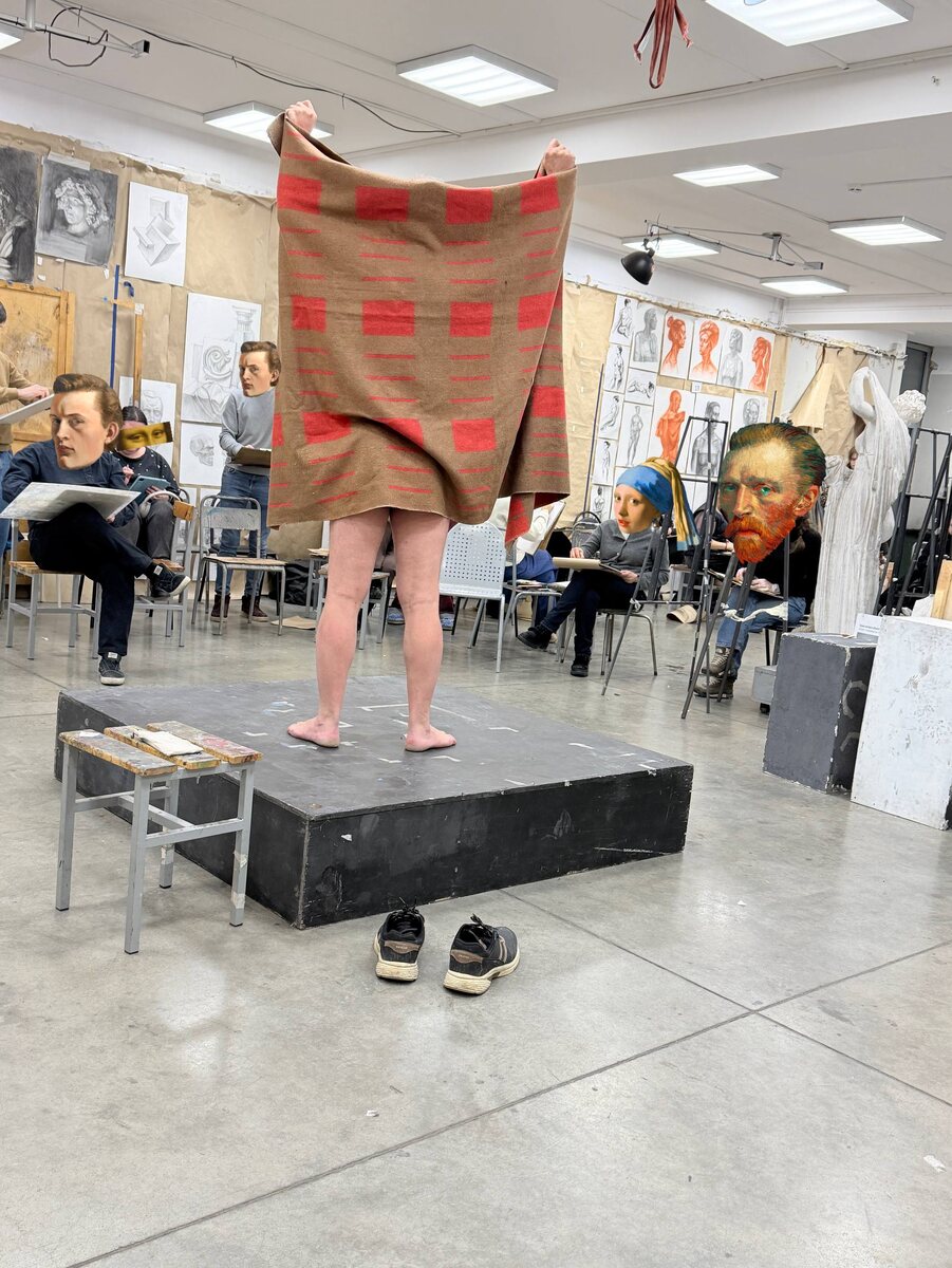 Сегодня АН пытался заинтересовать модель и студентов 😅 (на фото АН тоже есть, но это модель в одеяле) Двое мужчин - это редкость. Плюс, одна модель возрастная, другая- молодой ягненочек, славный бравый спортсмен. Мы успели порисовать всех! Много работ отобрали, что-то забраковали. Буду работать над линией