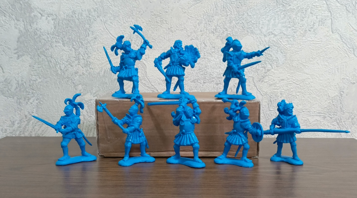 Ave любители солдатиков! Сегодня у нас в эфире, не очень круглая, но очень красивая цифра - 111! Игорь Ивкин прислал экспресс-обзор рыцарского набора. Фотографии - Игорь Ивкин. Передаю слово ему. Наконец-то до меня доехала посылка из Тулы с французскими рыцарями XV века. Поскольку совсем «нулевой» знаток экипировки рыцарей того периода, полез в интернет, чтобы понять во что они одеты и чем грозно размахивают. С «башмаками» разобрался быстро, ибо и у фигурок в наборе и, видимо, в реальности было только два типа: Несколько удивило отсутствие у всех, кроме одной фигурки, дополнительного бронирования бёдер. Хотя, возможно, для пешего боя броня частично снималась. Начал разбираться со шлемами. И тут же запутался. Так и не понял, чем большой басинет с коническим забралом, которое из-за своей формы по-немецки называлось «хундгугелем» (собачья голова) отличается от шлема «Армэ» с таким же забралом. Понял только то, что первые были популярны у англичан, а второй тип – у французов. Когда дело д