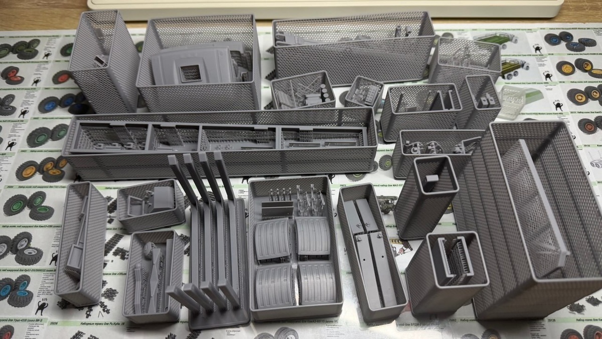 Московская ЪУЪ показала выпущенные на 3D-принтере детали своего конверсионного набора для постройки модели лесовоза в масштабе 1/35 на базе КамАЗ.