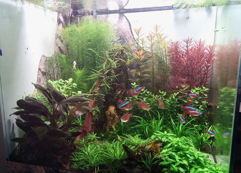 Население: 2 скалярии, 2 таракатума, 10 пецилобриконов, 7 тернеций, 10 клинопятнистых расбор.
