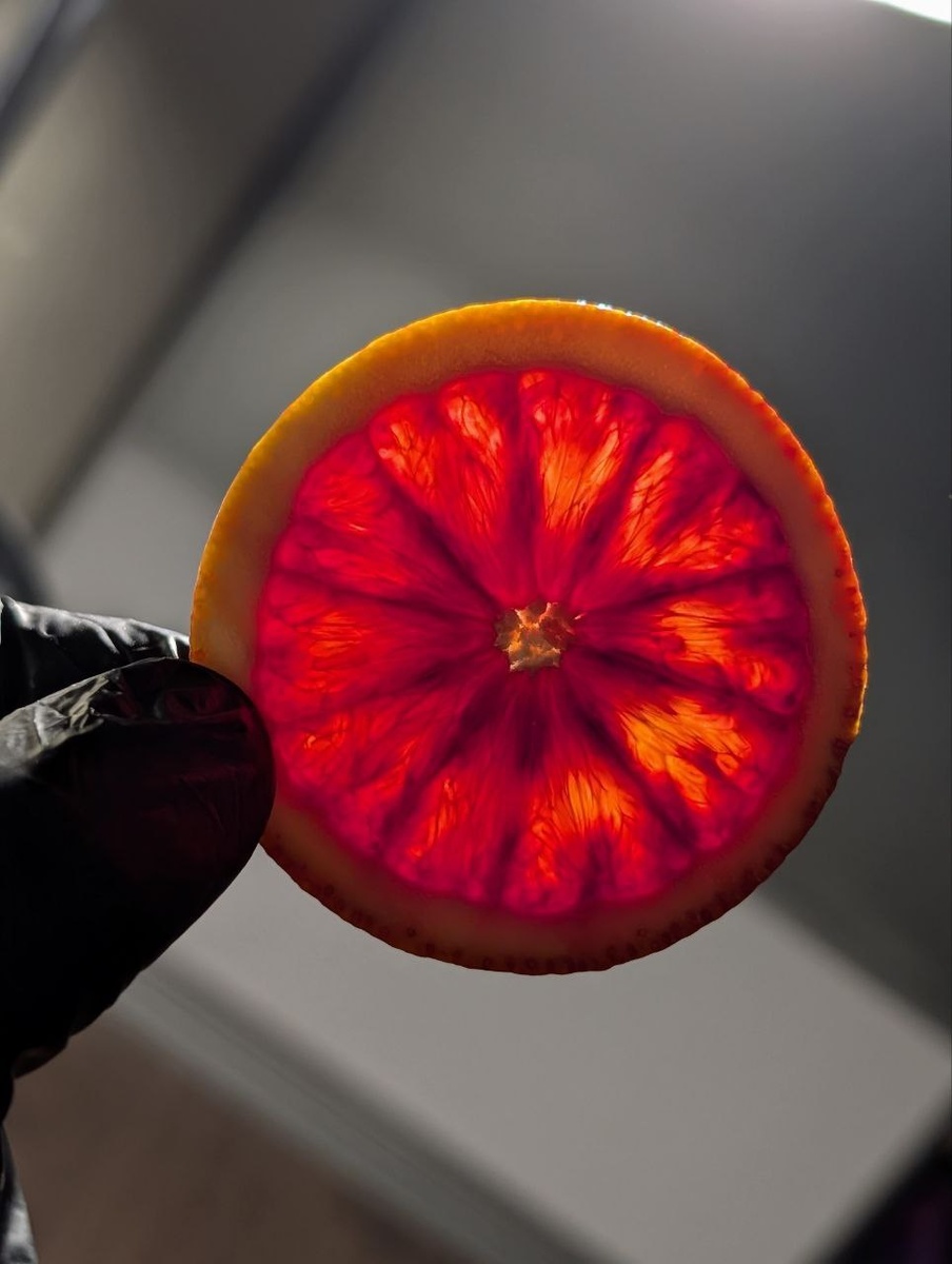 Просто кровавый апельсин сорта Сангвинелли. Сорт Сангвинелли (Sanguinelli) — это классический испанский кровавый апельсин. Его аромат заметно отличается от обычных «светлых» апельсинов: он более сложный, с выраженными ягодными (малиновыми или вишневыми) и цветочными нюансами. Основной «костяк» аромата составляют те же вещества, что и у других цитрусовых, но уникальность Сангвинелли — в их пропорциях и наличии специфических соединений. Основные компоненты аромата Как и в любом апельсине, львиную долю эфирного масла занимает лимонен (до 90–95%), но за характерный профиль Сангвинелли отвечают другие вещества: Лимонен: Основа запаха — свежий, ярко выраженный цитрусовый аромат. Мирцен: Придает легкий травянистый и металлический оттенок (вспомним дигидромирценол) Альдегиды (Октаналь и Деканаль): Эти вещества отвечают за «тело» аромата, придавая ему ту самую восковую, глубокую апельсиновую ноту. Линалоол: Обеспечивает нежный цветочный подтон, напоминающий лаванду или бергамот. Что дел