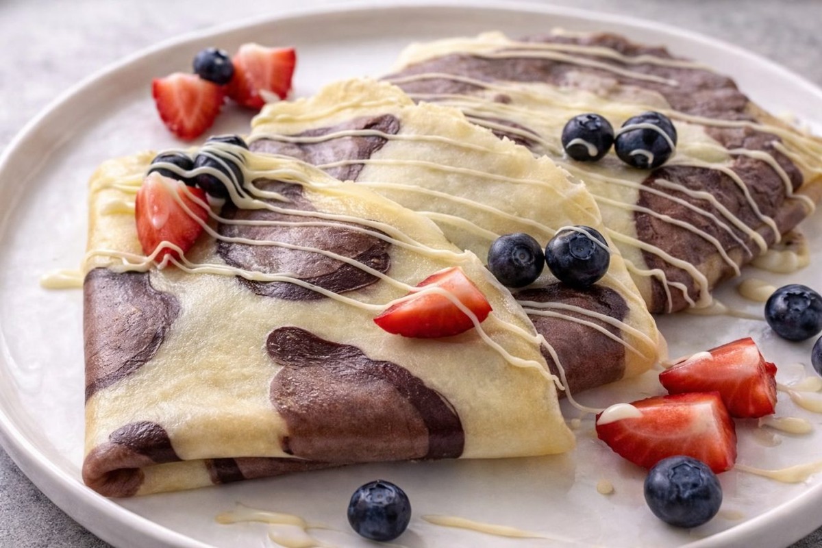 Каждый год на Масленицу появляется какой-то модный тренд: блогеры пекут то любимые розовые блины со свеклой, которые обожал Пушкин, то сворачивают из блинов затейливые розочки. В 2026 году хит Масленицы – леопардовые блины. Эта хищная расцветка выглядит шикарно и особенных ингредиентов не требует. Но на сам процесс выпечки придется потратить чуть больше времени. По сути, это классические блины, их главный секрет в том, что тесто делится на три части и использовать для рисования «принтов» бутылочку из-под кепчупа/горчицы или обычный пакет с отрезанным уголком. К этому творческому процессу можно смело привлекать детей, но сначала приготовим тесто. Приготовление: муку просеиваем и пока оставляем в стороне. Яйца взбиваем с солью в пышную пену. Удобнее всего делать это миксером: быстро и без лишних усилий. Венчиком тоже можно, но придётся запастись терпением. Не прекращая взбивать, вливаем кипяток – пена поднимется, но затем осядет, так и должно быть. Добавляем стакан холодного молока и про