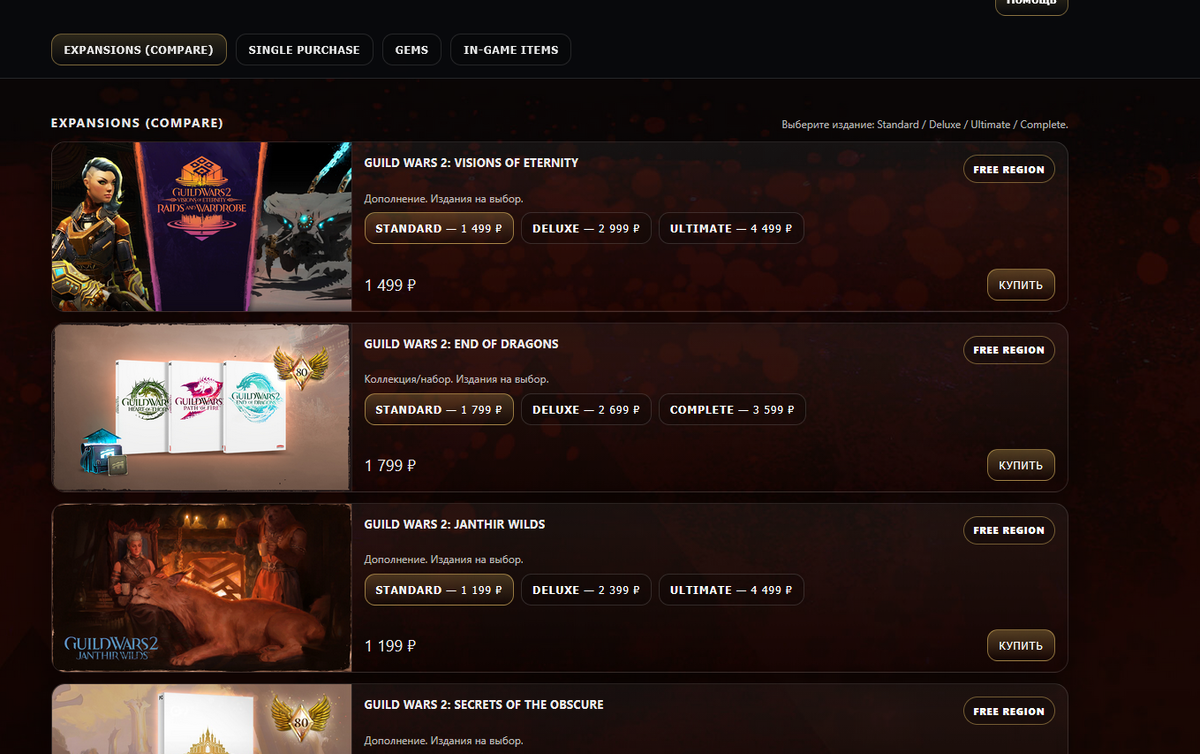 Как купить Guild Wars 2 в России в 2026 году — рабочие способы покупки изданий и дополнений Guild Wars 2 — одна из самых популярных MMORPG без обязательной подписки, но с платными дополнениями и наборами. Новые главы, расширения и апгрейды аккаунта требуют покупки, и именно здесь у игроков из России чаще всего возникают сложности — зарубежные платежи проходят нестабильно, карты отклоняются, транзакции отменяются. На практике купить Guild Wars 2 и дополнения из России можно несколькими способами. Они отличаются по сложности и надежности. Разберем по порядку — от самого простого варианта до более сложных альтернатив. Самый простой способ сегодня — покупка через рублевый игровой магазин без международного платежа. Это формат, при котором не нужна иностранная карта и не требуется проводить оплату через зарубежный шлюз. Вы выбираете нужное издание или дополнение и оплачиваете в рублях обычным способом. Страница покупки: https://gamebuy.run/guild-wars2