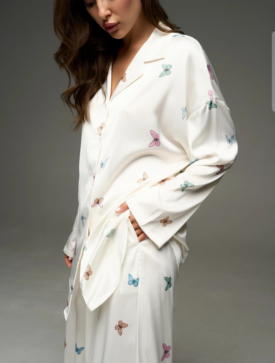 Нежная пижама со свободной посадкой из искусственного шёлка красиво струится по фигуре и приятна к телу. Атласная фактура материала придаёт пижаме элегантный вид.