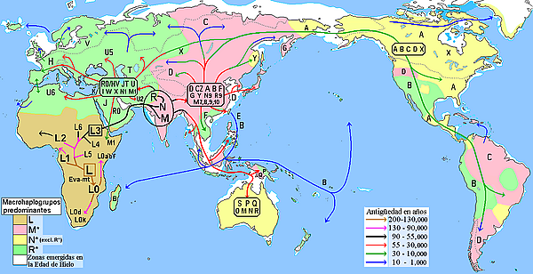 Карта раннего переселения народов, на основании митохондриальной популяционной генетики. Стрелки указывают на возраст в годах.