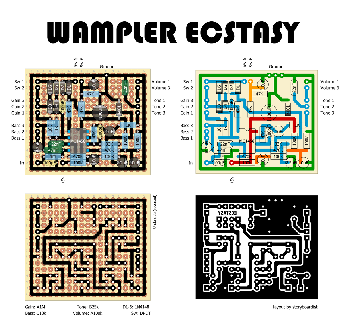 Wampler Ecstasy построена на полевых транзисторах (JFET), что является ключевым моментом. Брайан Вамплер использует JFET-ы потому, что они под лавированием напряжения ведут себя очень похоже на лампы (триоды), создавая мягкое насыщение и чёткий сатуратор.