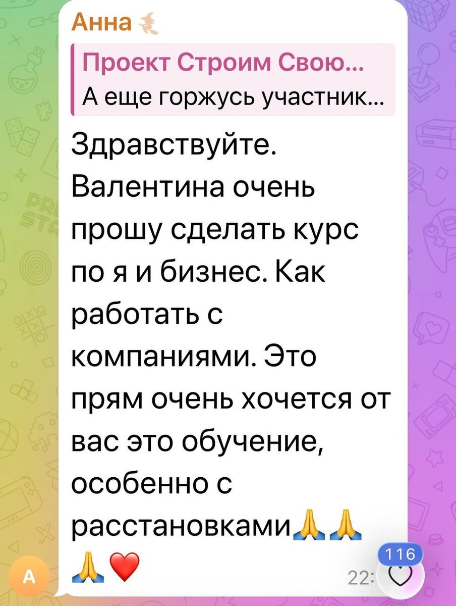 . Много лет работаю с темой бизнеса . Больше с мужчинами . Но есть и женщины . Если будет интересно для психологов и экспертов тема проработки компаний , бизнеса , проектов , работы с предприятиями могу сделать обучающий курс в полевой терапии + разборы + расстановки . Подскажу как видеть слепые пятна в бизнесе и выводить проекты , бизнес на новые уровни процветания и изобилия . Программа ,, Бизнес разборы ‘’ ! Кому хочется попасть на такую обучающую программу + проработки вашего проекта пишите ,, Бизнес ‘’
