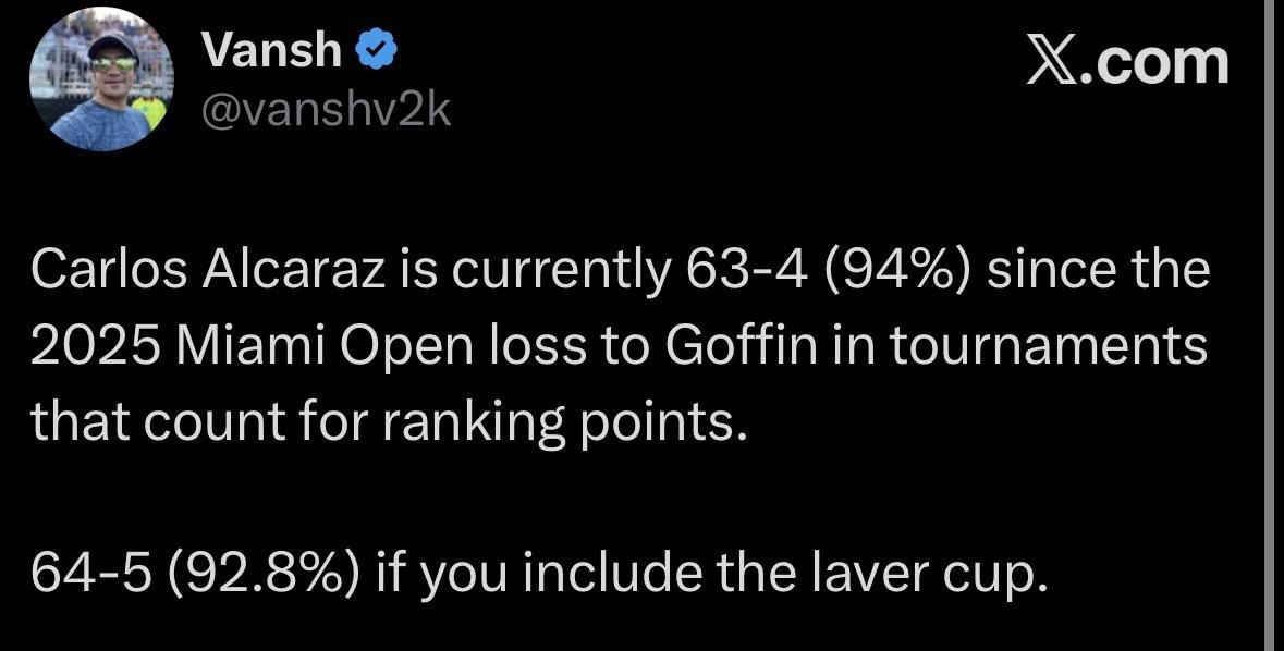Карлос Алькарас имеет статистику 63-4 (94%) в турнирах, идущих в зачет рейтинга, после поражения от Гоффена на Miami Open 2025.
