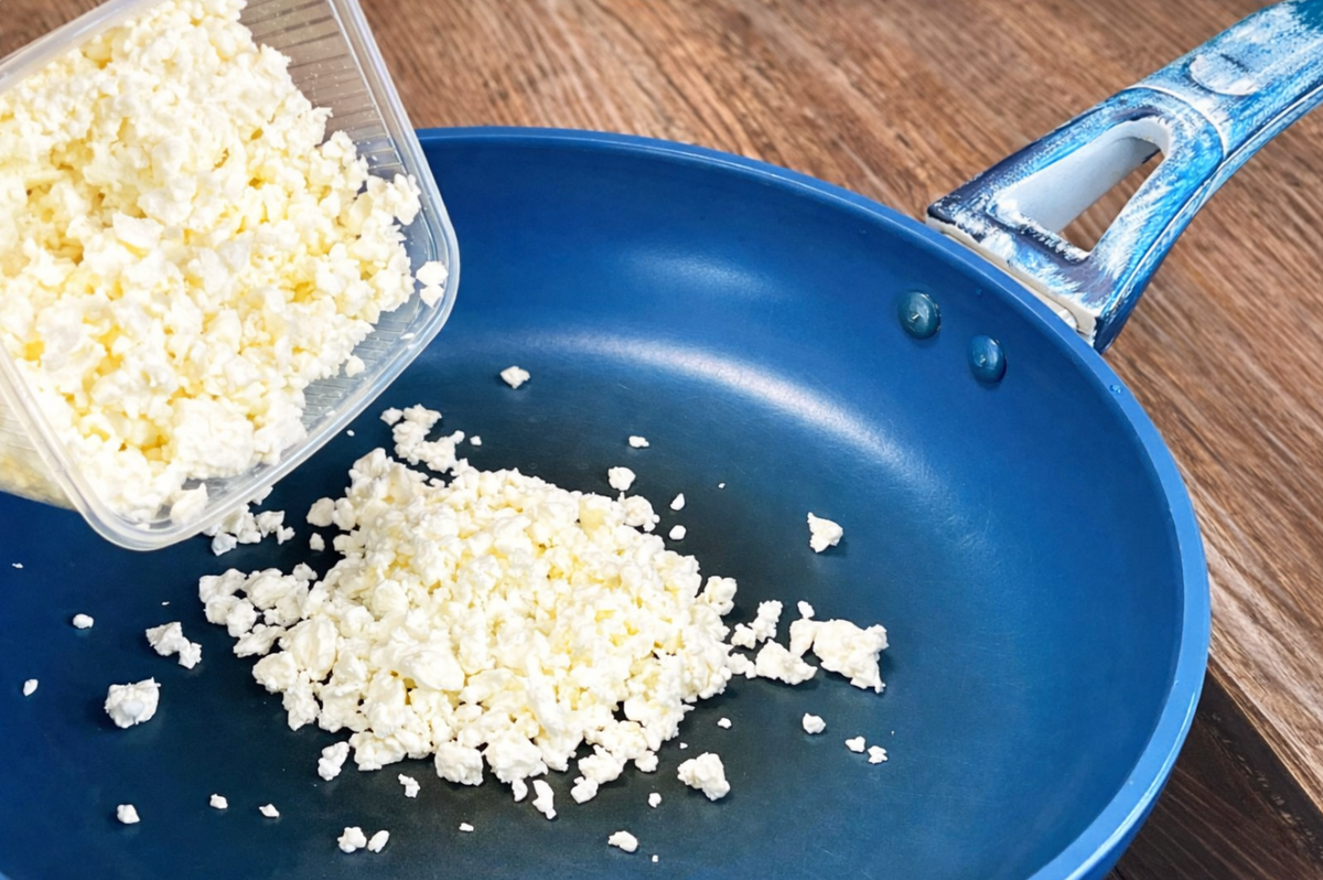 Вкус — насыщенный, сливочный, с приятной поджаристой ноткой. Теперь готовлю так постоянно. Делюсь способом. При нагревании творог слегка подсушивается, уплотняется и начинает подрумяниваться. Лишняя влага уходит, а вкус становится более концентрированным и ярким. Главное — выбрать правильный творог и соблюдать несколько простых правил. Творог слегка разминаю вилкой.