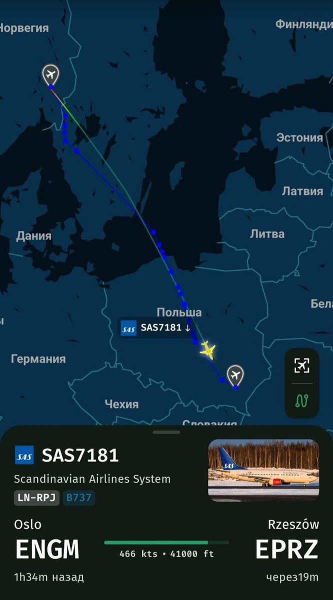 Boeing 737-783 авиакомпании SAS (рейсы выполняются по соглашению с властями Норвегии) позывной: SAS7181, бортовой номер: LN-RPJ, рейс: Осло (ENGM) - Жешув (EPRZ). https://dzen.ru/id/6425916a1950720421f18802