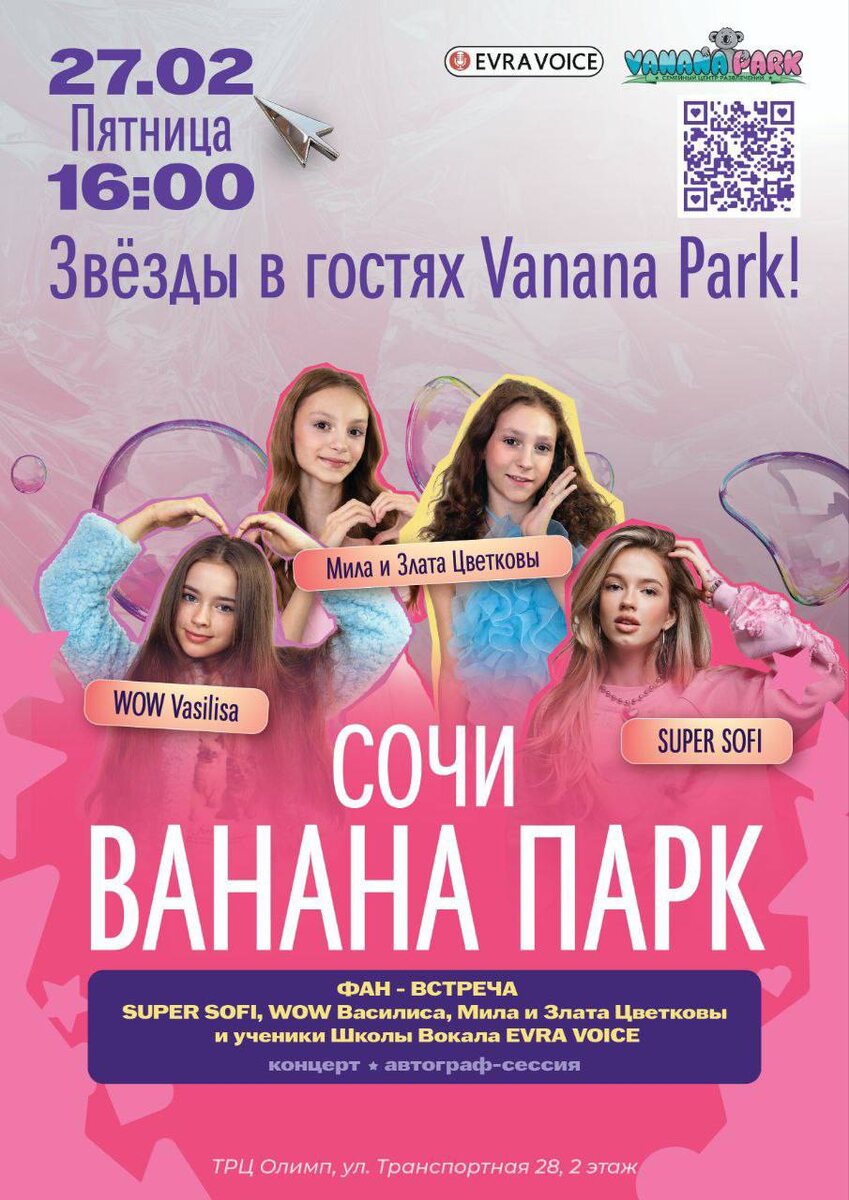 💋 Блогеры в гостях Vanana Park! 😍 🔔ФАН - ВСТРЕЧА: SUPER SOFI, WOW Василиса, Мила и Злата Цветковы и ученики Школы Вокала EVRA VOICE 💗 ‼️27 февраля | Пятница | 16:00‼️ 🎤 16:00 — Концерт учеников школы вокала EVRA VOICE На сцене — юные звёзды и блогеры: София, Василиса, Злата и Мила! ⭐ 17:30 — Автограф-сессия Каждый сможет пообщаться, сделать фото и получить автограф любимых блогеров! В программе праздника: 🎶 Живые песни 💃 Танцевальные игры 📸 Яркие фото и море эмоций 🎉 В финале — зажигательная бумажная дискотека! ✨Не пропустите событие, о котором будут говорить все — станьте частью этой звёздной встречи!