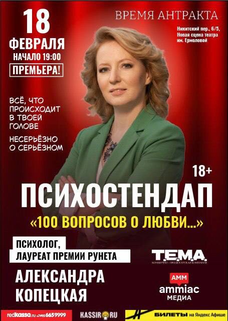 100 ВОПРОСОВ О ЛЮБВИ. «100 вопросов о любви» — не разговор о чувствах. Это ТРЕНИРОВКА МЫШЛЕНИЯ. Легко, по-женски и с юмором. Психостендап, который учит не «починить отношения», а вернуть себе контроль. Где важно не «кто прав», а ваша устойчивость. 18 февраля в 19:00 в формате живого клубного шоу состоится премьера проекта «Психостендап «100 вопросов о любви». Забудьте про нравоучения и разговоры «по душам». Психостендап — это интенсив для вашей головы. Александра Копецкая не будет чинить вас или вашего партнёра. Она даст вам инструменты, чтобы вы перестали быть заложником ситуаций и эмоций. Формула вечера: 1. Александра берёт неудобный вопрос о любви, отношениях, ревности или одиночестве. 2. Анализирует шаблон, который заставляет вас наступать на одни и те же грабли. 3. Меняет ракурс. Перезагружает реакцию. Возвращает вам контроль. Ведущая и формат: Александра Копецкая — известный психолог, автор бестселлера «100 вопросов о любви», лауреат премии Рунета, создатель популярного под