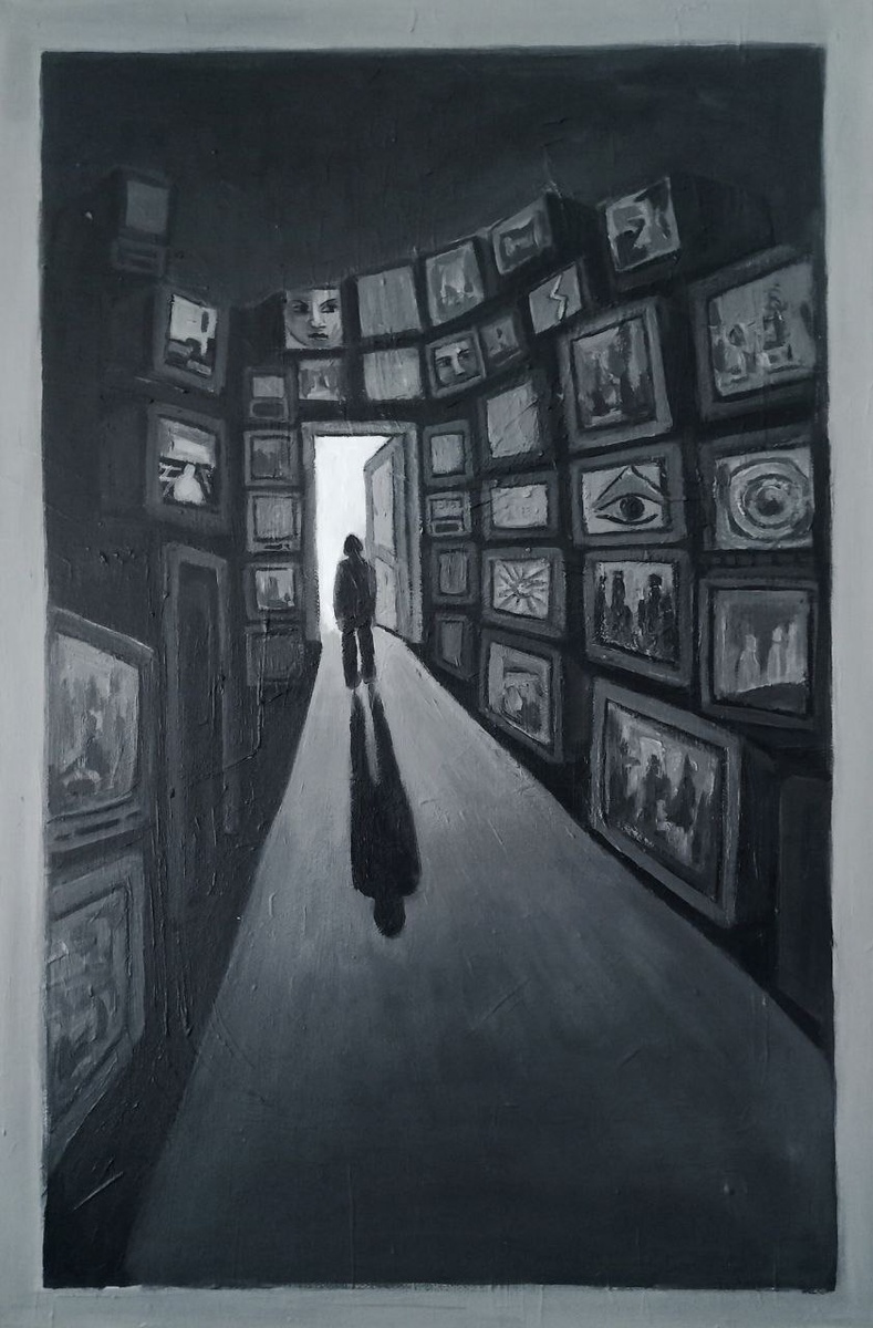 ». Дело было где-то на Ваське. Придя по указанному адресу, мы обнаружили лишь закрытые двери. Из любопытства решили заглянуть в замочную скважину. Перед моими глазами предстала совершенно неожиданная картина. У стены громоздились старые мониторы от компьютеров начала двухтысячных годов. Один из них мерцал таинственной заставкой, напоминающей экран компьютерной игры. Моя работа выполнена в монохромной гамме. Экраны мониторов показывают чётко или расплывчато разнообразные образы. Композиция отражает переизбыток информации и визуальных стимулов, окружающих современного человека. Это также символ наших внутренних видений, возникающих одновременно, словно экраны транслируют сны из разных временных линий параллельно. Девушка проходит по этому коридору, оставив позади весь хаос, чтобы остаться в пространстве света и тишины. «Истина заключается не в одном сне, а в переплетении множества снов.» Название: «Сны о чём-то большем». Размер: 40 × 60 см. Материал: Акрил, холст. Год: 2025. #nikazart