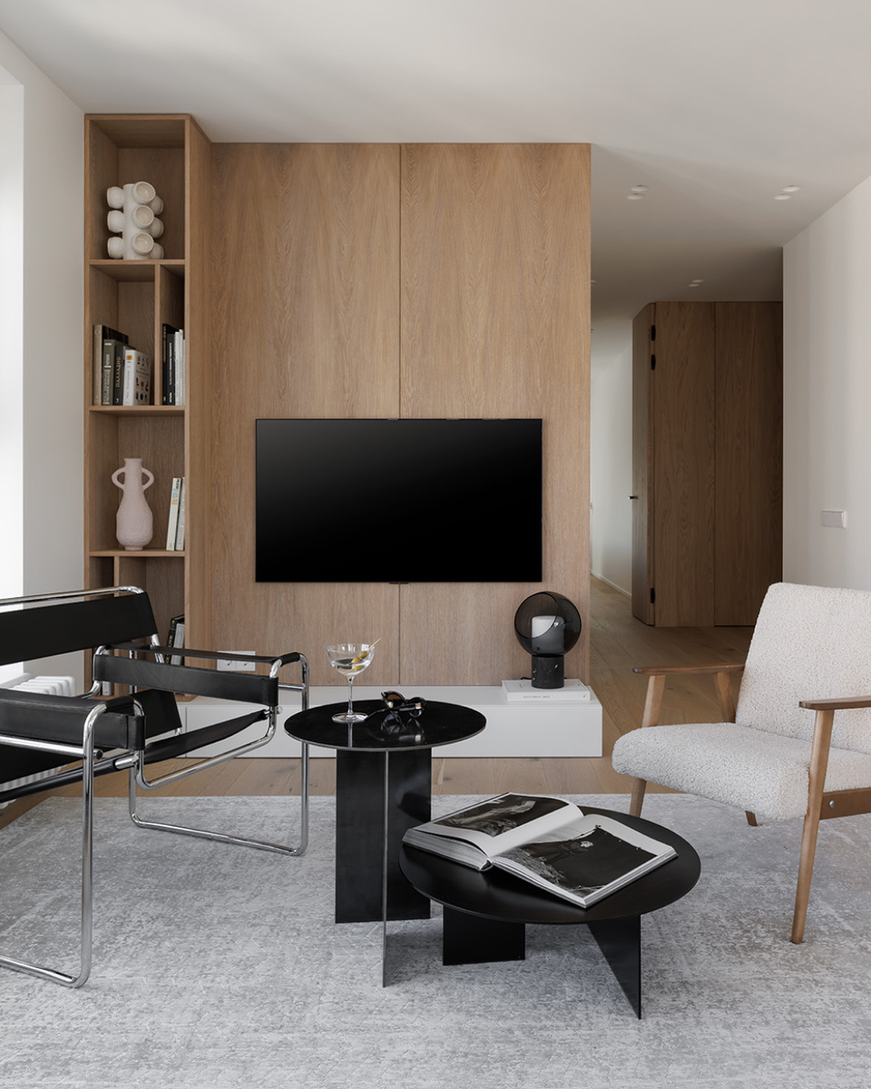 Рум-тур команда канала «Дизайн интерьера» снимала еще в 2023 году, но интерьер не теряет своей актуальности. Для ванных комнат дизайнер выбрала скрытые двери под покраску в потолок с черной алюминиевой кромкой и черной фурнитурой. А для спальни и кабинета – двери коллекции Base с панелями из шпона с обратным открыванием. «Это обычные двери. МДФ покрытый шпоном. Сделана панель между дверьми, что пространство между ними никак не надо было красить. Визуально это выглядит очень круто. Мне кажется, что это такая большая стена», — говорит Ольга. В обзоре этой квартиры на ютуб-канале «Дизайн интерьера» Ольга показала еще одно решение фабрики Фрамир: скрытая дверь под покраску на раздвижной системе. Смотрите на YOUTUBE Автор проекта: Ольга Копосова Авторы видео: канал Дизайн интерьера Фотограф: Иван Сорокин Стилист: Диана Ремизова Двери Фрамир: Base 1 с панелями Komplanar в цвете шпона дуб Грано, скрытые двери Secret
