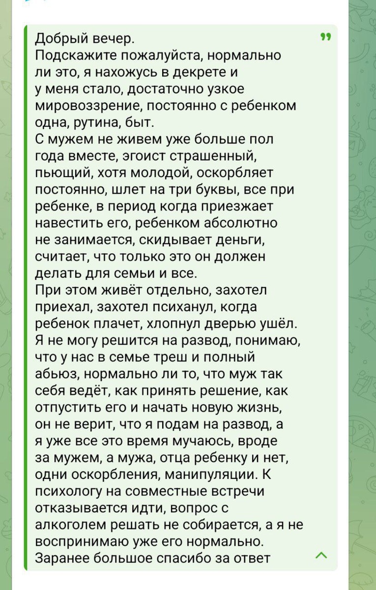 Спасибо за доверие. То, через что вы проходите, находясь в декрете с малышом на руках, - это колоссальная нагрузка на психику. Давайте разбираться по порядку, бережно и честно. «Нормально ли это?» Короткий ответ: нет, это абсолютно ненормально. То, что вы описываете, это классическая картина абьюзивных отношений, осложнённых алкогольной зависимостью партнёра. Нормальные, здоровые отношения строятся на уважении, заботе, предсказуемости и безопасности. Посмотрите на факты: Оскорбления и мат в присутствии ребёнка - это прямое эмоциональное насилие, которое ранит вас и малыша. Игнорирование потребностей ребёнка (уход, когда тот плачет) и нежелание заниматься им - это инфантильность и эмоциональная холодность. Отказ решать проблему с алкоголем и посещать психолога - это отсутствие всякой мотивации что-то менять. Ваше ощущение, что «мировоззрение сузилось» нормальная защитная реакция психики, которая находится в режиме выживания. Когда каждый день, как хождение по минному полю, организ