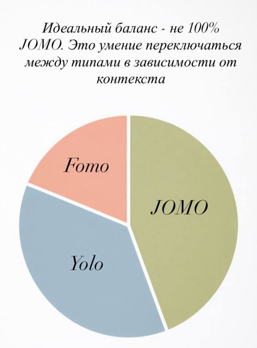 В эпоху неразумного потребления очень тяжело держать себя в руках перед импульсивной покупкой. Я тоже так думала, пока не начала следить за собой. Привычка все время что-то и кого-то догонять ушла, а деньги на карте появились. Сегодня я расскажу, как это сделать быстро и безболезненно. Для начала, что такое ДЖОМО? JOMO – это радость от того, что вы чего-то не знаете. Да-да, полная противоположность ФОМО, о котором мы говорили в прошлых статьях. В голове у людей с таким типом личности звучит: «Спокойно, ты ничего не упускаешь». Это не про то, чтобы быть отшельником. Это про то, чтобы самому решать, что нужно, а что нет. Что было «до»? Наверняка вам это знакомо: вместо спокойного утра с чашкой кофе и завтраком, ты выбираешь телефон и просмотр ленты. А в социальных сетях ты видишь хорошенькое платье у подруги, новинку любимого бренда, классные кроссовки на ногах у блоггера и нашла «обязательный» онлайн-курс. А это только утро. Впереди еще целый день, а бюджет на месяц уже распланирован на