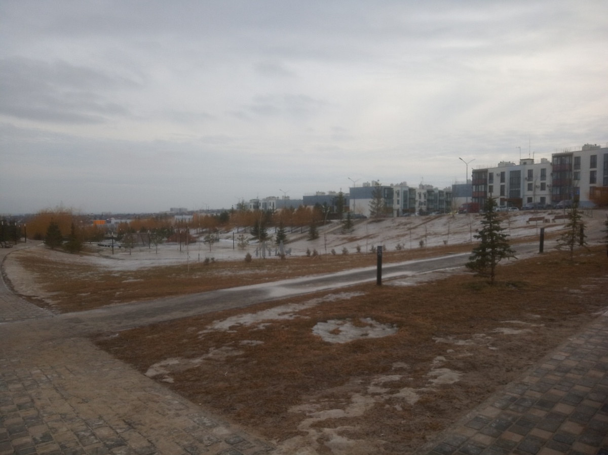 Морозы сошли, начал таять снег. Небо серое; вчера было +8, сегодня - +1.
