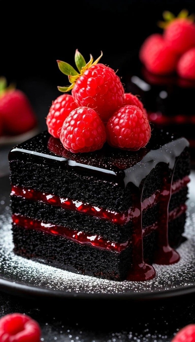 6. Каждый корж слегка пропитайте водой, смажьте кремом и выложите ягоды малины.