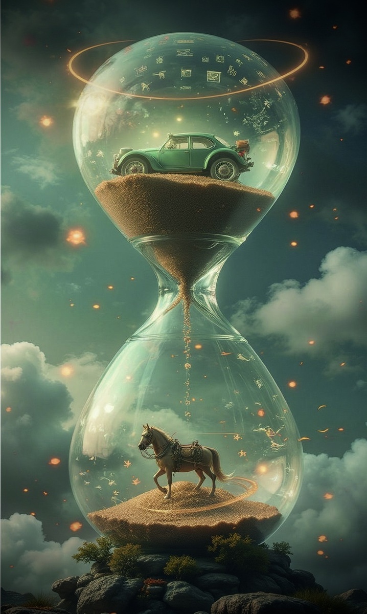 В верхней колбе - винтажный автомобиль. В нижней - гордый конь. Каждая песчинка содержала воспоминание о путешествии.