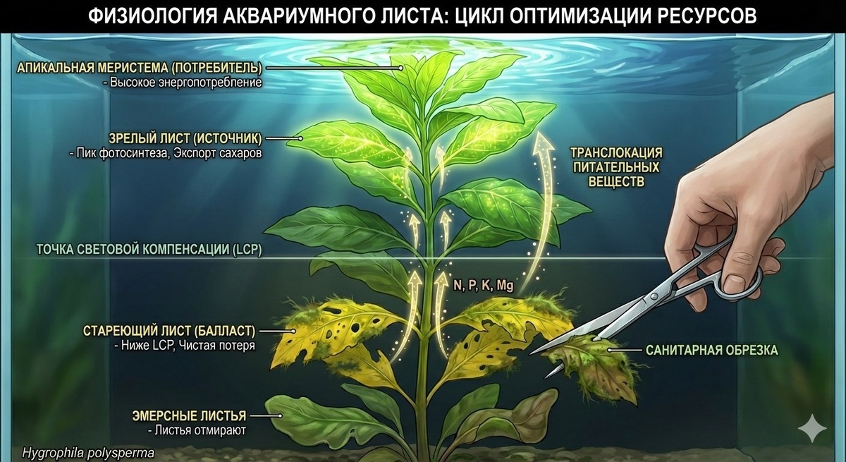 ) В аквариумистике существует распространенное заблуждение, что здоровое растение обязано сохранять идеальную листву от корней до самой верхушки на протяжении всего жизненного цикла. Однако с точки зрения ботаники лист — это не постоянный орган, а временный инструмент с четко определенным сроком эксплуатации и коэффициентом полезного действия (КПД). Понимание биохимических процессов старения и обновления тканей позволяет аквариумисту управлять внешним видом подводного сада не интуитивно, а опираясь на научные данные. 1. ЭКОНОМИЧЕСКАЯ МОДЕЛЬ РАСТЕНИЯ: ИСТОЧНИКИ И ПОТРЕБИТЕЛИ Растительный организм функционирует как жесткая экономическая система, оперирующая понятиями 'Source' (источник энергии) и 'Sink' (потребитель). Молодые, развивающиеся листья на верхушке стебля (апикальная меристема) являются 'потребителями'. Они активно расходуют углерод и азот на строительство клеточных стенок и синтез ДНК. Зрелые, полностью сформированные листья — это 'источники'. Они вышли на пик фотосинтетиче