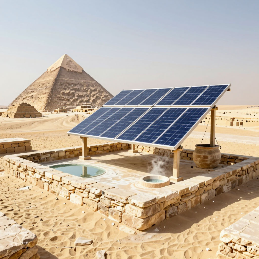 Современные фотоэлектрические панели, преобразующие солнечный свет в электричество, появились лишь в XIX–XX веках. Но история использования солнечной энергии началась тысячелетия назад — древние цивилизации находили способы применять её для отопления, готовки, получения соли и даже в военных целях. Египтяне мастерски проектировали жилища с учётом солнечной экспозиции: Такой подход обеспечивал комфортный микроклимат в домах без дополнительных источников энергии. Самая известная легенда связана с именем Архимеда. Согласно преданию, во время осады Сиракуз он использовал систему зажигательных зеркал, чтобы поджечь вражеские корабли. Принцип был прост: отражённые от зеркал солнечные лучи фокусировались на деревянных корпусах судов, вызывая возгорание. Хотя историчность этого события остаётся предметом дискуссий, сама идея демонстрирует понимание древних греков принципов концентрации солнечной энергии. Римляне внедрили солнечные технологии в общественные сооружения — прежде всего, в термы (б
