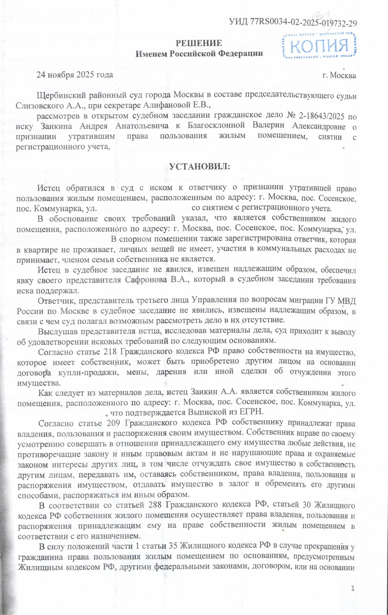 В ноябре 2025 года Щербинский районный суд города Москвы рассмотрел иск Заикина А.А. к Благосклонной В.А. о признании утратившей право пользования жилым помещением и снятии с регистрационного учета. Истец, являясь собственником квартиры в поселке Коммунарка, указал, что ответчик, зарегистрированная в его квартире, фактически там не проживает, не имеет личных вещей и не участвует в оплате коммунальных услуг. Суд удовлетворил исковые требования Заикина А.А., признав Благосклонную В.А. утратившей право пользования жилым помещением и обязав её сняться с регистрационного учета. Решение суда вступило в законную силу.
