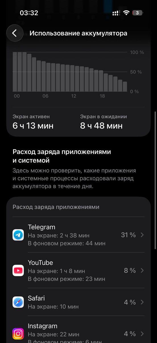 ⚡️Автономность iOS 26.4 Beta 1 Снял с зарядки в 23:55 и активно пользовался до 07:00 утра, а потом с 15:00. В итоге в 03:32 остается 3%. По условиям все стандартно для меня: LTE на двух симках, вайфай/сотовая сеть 50/50 по времени. Яркость 50%. Как обычно соцсети, браузер, ютуб, навигация. Айфон 17 Про, емкость аккума 100%. Always On и 120гц включены. В итоге около 8 часов экрана. Очевидно, что хуже чем на 26.3, но для беты норм. Как у вас?🤔
