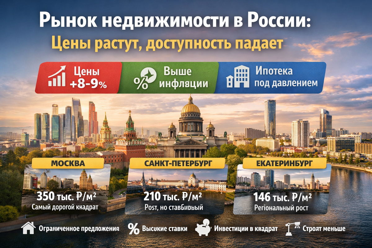 По итогам 2025 года рынок жилой недвижимости в России продемонстрировал разнонаправленную динамику: цены продолжили расти и в ряде сегментов опередили официальную инфляцию, тогда как темпы ввода нового жилья начали замедляться. К началу 2026 года формируется новая конфигурация спроса и предложения — с более осторожными покупателями, изменённой ипотечной моделью и акцентом на крупнейшие города.