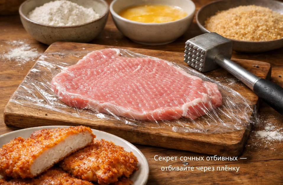 Метод отбивания через плёнку действительно работает и кардинально меняет результат. Попробуйте один раз, и вы сами убедитесь, насколько проще становится процесс и насколько лучше получается мясо. Ваши отбивные больше никогда не будут жёсткими и сухими. Это тот самый случай, когда маленькая хитрость решает большую проблему и превращает обычное блюдо в настоящий кулинарный шедевр.