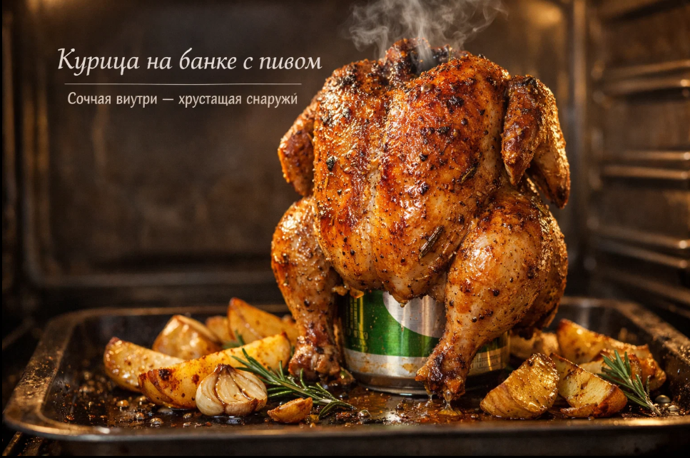 Суть метода заключается в том, что курица готовится в вертикальном положении, буквально сидя на банке с пивом. Во время запекания пиво испаряется, наполняя птицу изнутри ароматным паром. Этот пар распространяется по всей внутренней полости курицы, делая мясо невероятно сочным и нежным. При этом жир с кожи стекает вниз, а не накапливается внутри, благодаря чему получается золотистая хрустящая корочка снаружи и влажное, ароматное мясо внутри.