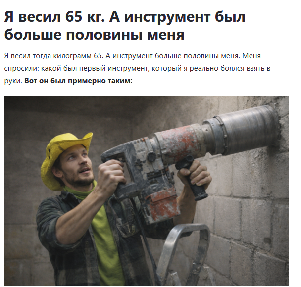 Меня спросили: какой был первый инструмент, который я реально боялся взять в руки. Я тогда весил около 65 кг, а эта штука дернулась так, что я ногой поймал стремянку, чтобы не сложилась.