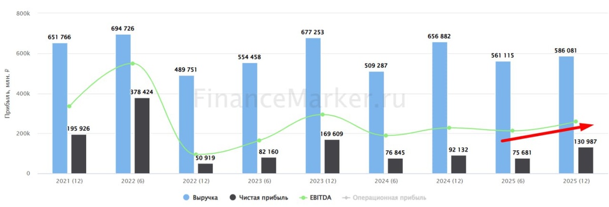 📊 Недавно я разбирал операционный отчет ГМК Норникель. Сегодня поговорим о финансах. Главное, что всех интересует: стало ли больше ясности по дивидендам? 📈 На фоне стагнации физических объемов производства и роста цен, валютная выручка в 25 году прибавила 10% г/г, а EBITDA 9%. Рублевый результат, естественно, хуже из-за крепкого рубля. ✔️ Расходные статьи изменились слабо. Капекс вырос на 8%, процентные платежи с $1,5 до $1,7 млрд. Сам чистый долг увеличился на 6%, а соотношение ND/EBITDA слегка снизилось до 1,6х на фоне роста EBITDA. 💰Скорректированный свободный денежный поток вырос в 4 раза до $1,48 млрд за счет низкой базы прошлого года, роста выручки и изменений в оборотном капитале. Если его полностью направить на дивиденды, то доходность составит 4,8% (при курсе доллара в 77 рублей). Не впечатляет. Но учитывая, что инвесторы сидят на голодном пайке уже несколько лет, рынок позитивно воспринял бы даже небольшую выплату. 📈 Основной рост цен пришелся уже на 1 квартал 26 года. Е