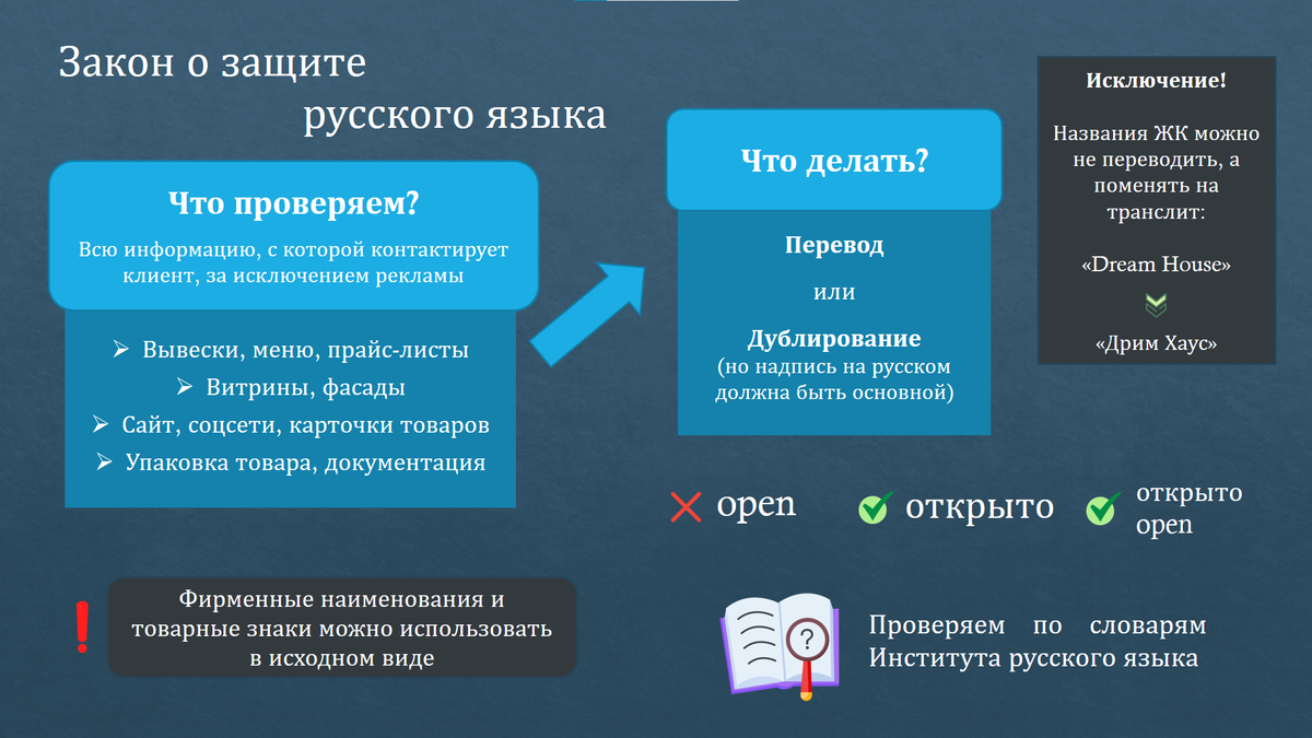 Поскольку в воскресенье у нас будет традиционная подборка товарных знаков, то напоминаю сегодня: с 1 марта вступают в силу положения закона «о защите русского языка». Я разбирала эту тему в двух постах: ▪️ общие правила и исключения: что и как «русифицировать», что можно оставить; ▪️ как понять, какие слова переводить: проверяем по официальным словарям РАН. ✅ Два легальных способа: ➡ перевод (Open → «Открыто»), ➡ дублирование («Открыто/Open»), при этом русский текст должен быть основным. ✅ Нельзя просто транслитерировать (Sale → «Сейл») - нужен смысловой эквивалент («Распродажа»). ✅ Можно не переводить: 📚 Главный помощник – сайт Института русского языка им. Виноградова. Есть две новости: плохая и хорошая.