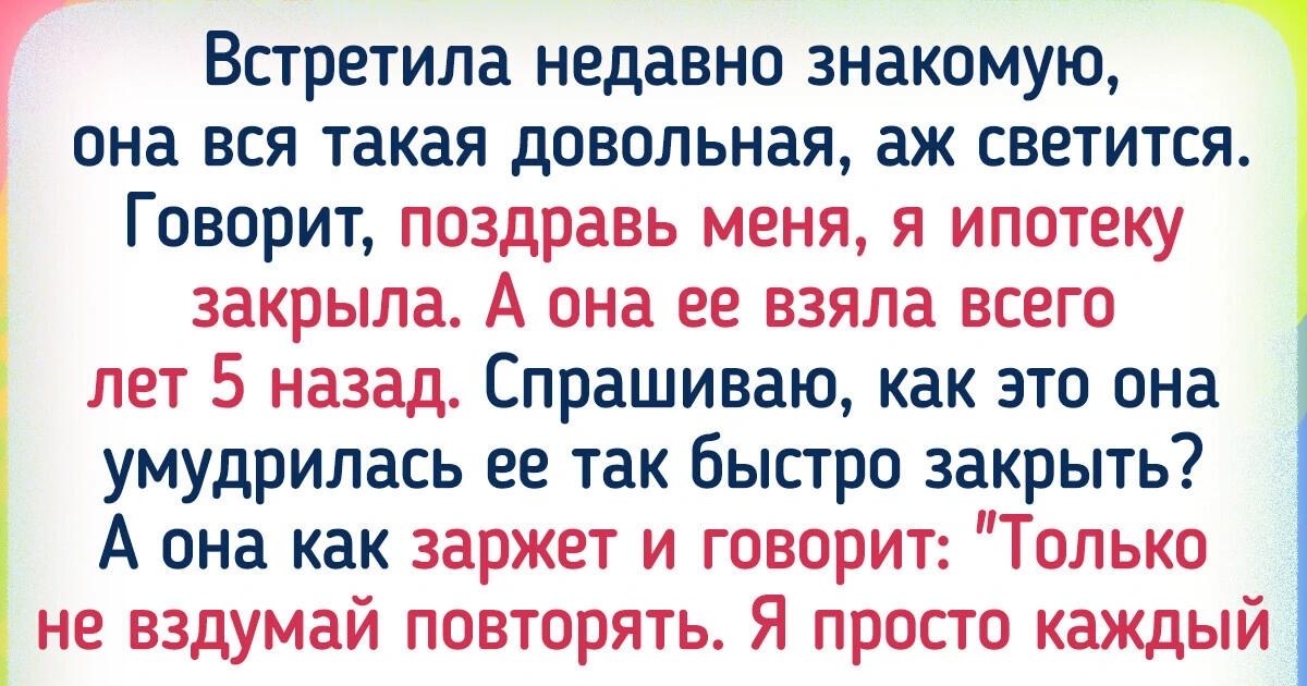 «Встретила недавно знакомую, она вся такая довольная, аж светится. Говорит, поздравь меня, я ипотеку закрыла. А она ее взяла всего лет 5 назад. Спрашиваю, как это она умудрилась ее так быстро закрыть? А она как заржет и говорит: Только не вздумай повторять. Я просто каждый раз все старалась сделать бесплатно и превратила это в игру. Помыться у родственников и друзей, поесть у них же. Стирала потихоньку на работе, там же телефон заряжала и все, что могла. Удавалось сохранить почти 85 процентов зарплаты. Но это был ад, конечно. Мы еще немножко поболтали и разошлись. А я до сих пор думаю, что ни за что бы на такую экономию не пошла.»