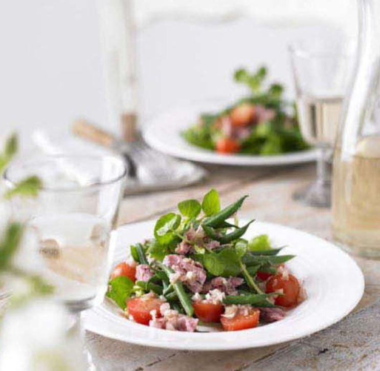 Время приготовления - 10 минут. 2 порции. Ингредиенты: 1. Смешайте вместе дижонскую горчицу, уксус, 2 столовые ложки оливкового масла, лук шалот и приправьте. Отварите фасоль, затем хорошо её просушите. Перемешайте с заправкой из горчицы, уксуса, оливкового масла и лука. 2. Положите смесь в миску. Добавьте свининиу и помидоры, перемешайте и добавьте листья салата. В одной порции: 204 килокалории, 13.6 граммов белка, 5.3 грамма углеводов, 14.4 грамма жиров, 2.4 грамма насыщенных жиров, 3.1 грамма клетчатки, 1.21 грамма соли.
