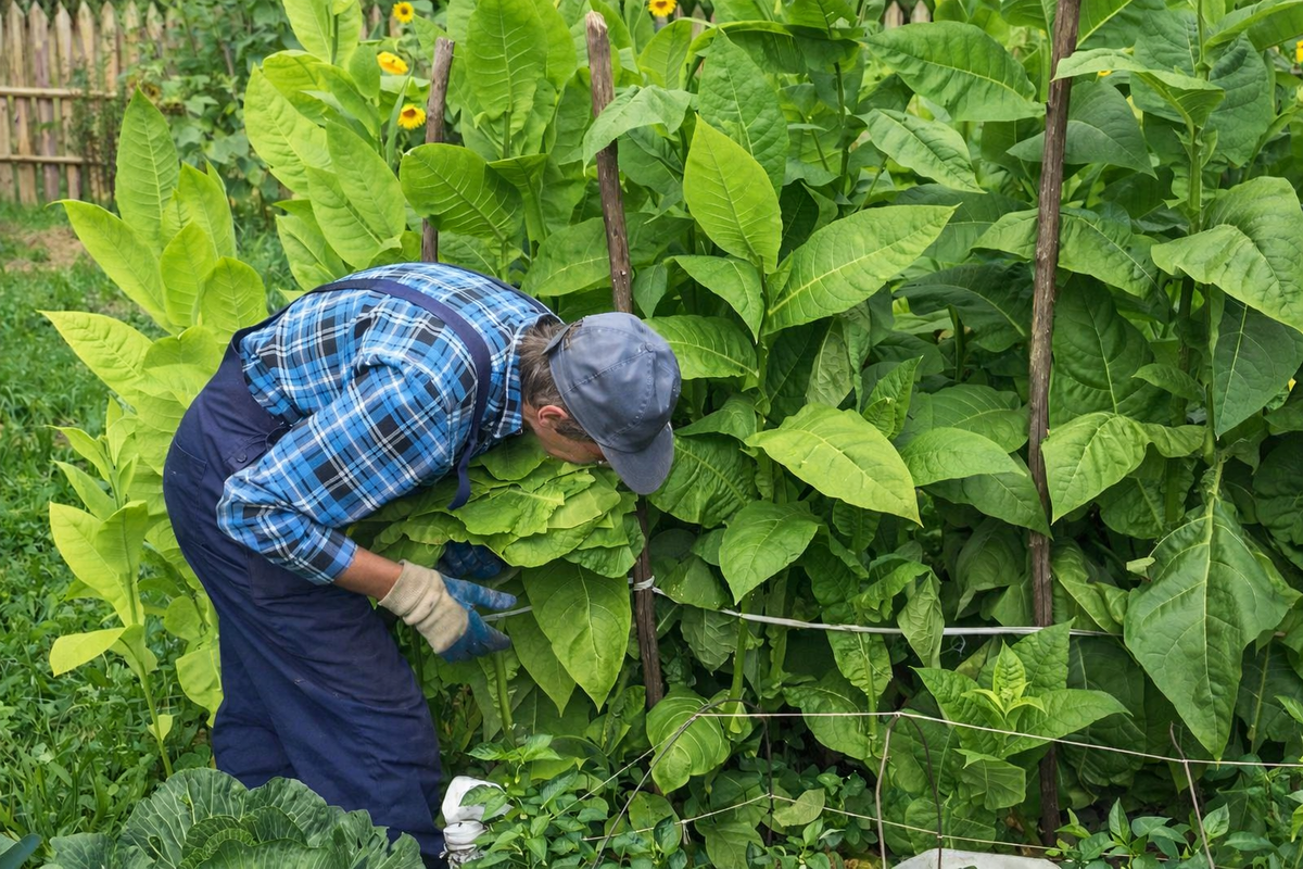 Не рвите всё сразу. Табак зреет ярусами, снизу вверх. Спелый лист светлеет, становится липким от смол, а центральная жилка при надломе издает характерный сухой щелчок.