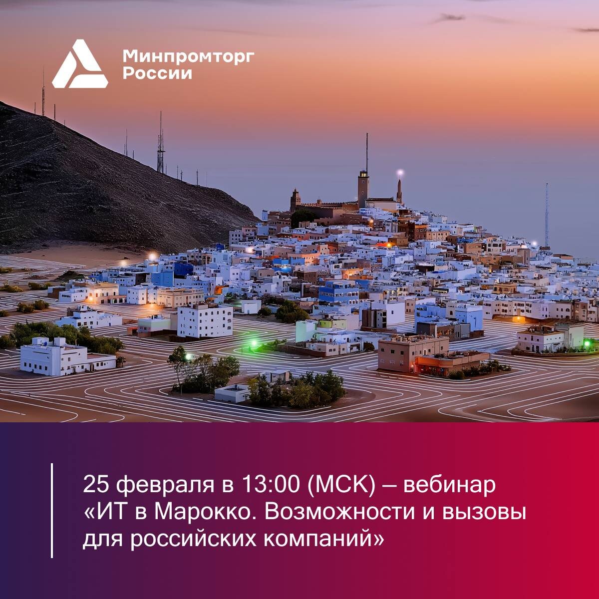 Возможности и вызовы для российских компаний» 🇲🇦 25 февраля в 13:00 (мск) приглашаем на вебинар представителей бизнеса, заинтересованных в освоении ИТ-рынка Марокко. В программе: 🔹Обзор экономических показателей Марокко. 🔹Анализ законодательства в сфере цифрового развития. 🔹Перспективные ниши для экспорта российских ИТ-продуктов. 🔹Стратегии выхода на рынок. 🔹Основные барьеры и возможные пути их преодоления. Эксперты: ▶️ Алексей Андреев, Торговый представитель России в Марокко; ▶️ Никита Стегний, «цифровой атташе» Торгового представительства России в Марокко. Организатор мероприятия — Минпромторг России при поддержке ФГАУ "ЦИТ". Регистрируйтесь, чтобы получить ответы на интересующие вас вопросы в прямом эфире. #Марокко #Цифровые_атташе #ИТ #минпромторг MAX | Telegram | Дзен